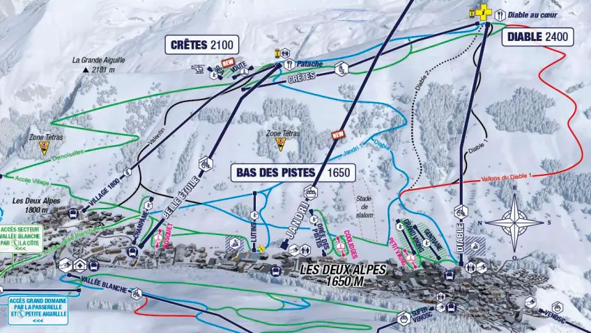 Access detailed maps of the 2 Alpes, Mont-de-Lans, and Venosc ski areas to easily plan your skiing days.